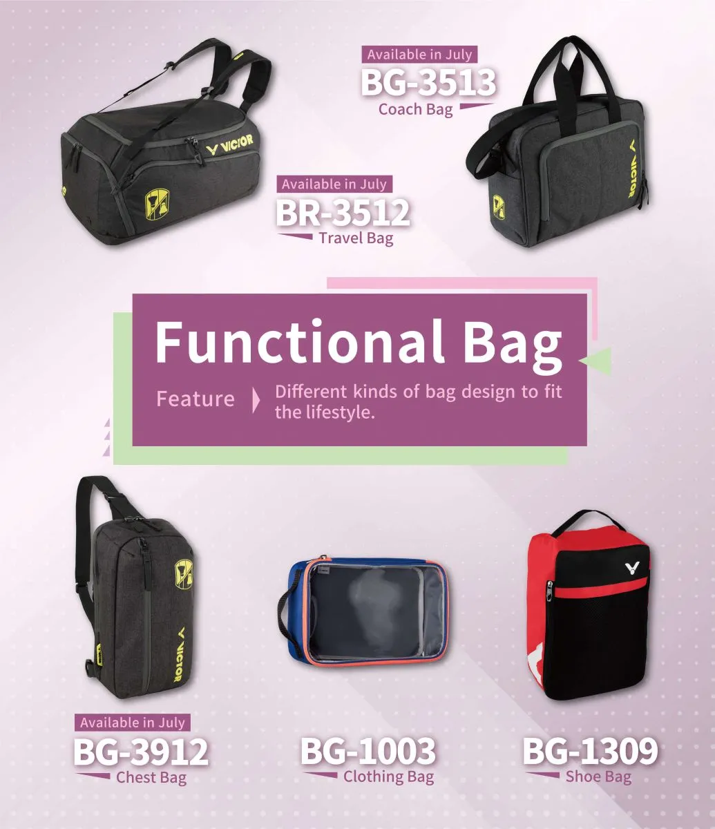 VICTOR has studied a wide range of types of players and come up with the solutions for all kinds of needs. From easy-to-carry backpacks, to versatile two-way functional bags, the following illustrations will give you a full idea what VICTOR offers. Let's find your own VICTOR Bag.