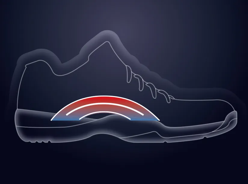 The Tri-Arch support control is an arch design of the footbed based on the three arches of the foot: medial and lateral longitudinalarches and transverse arch. Tri-Arch is ergonomically designed to keep the original curvature of the three arches, which offers a more comfortable support to the sole, evenly distributes the pressure, and enables better controllability.