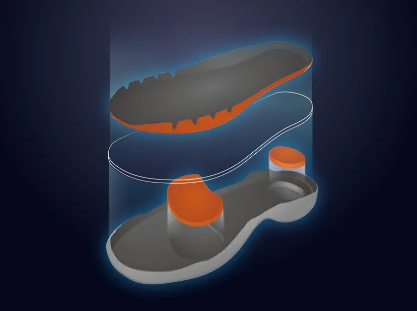 The newly invented midsole: Based on the principle of biomechanics, the special cushioning/elastic material is overlapped with the midsole material to achieve a midsole with both energy absorption and stable support.