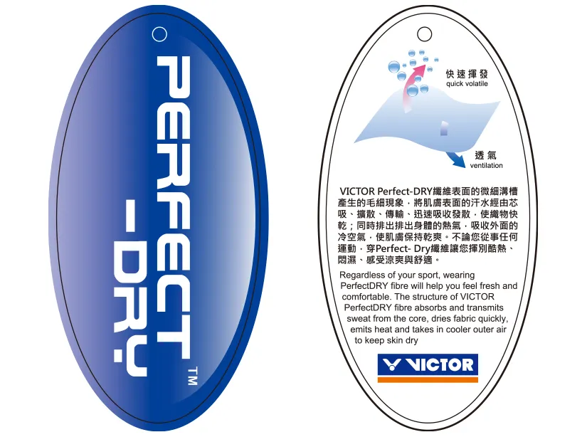 Regardless of your sport, wearing Perfect DRY fiber will help you feel fresh and comfortable. The structure of VICTOR Perfect DRY fiber absorbs and transmits sweat from the core, dries fabric quickly, emits heat and takes in cooler outer air to keep skin dry.
